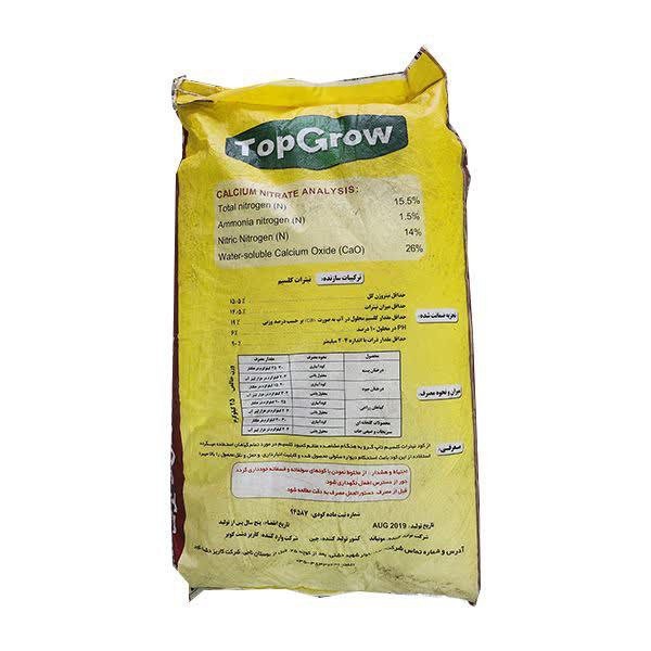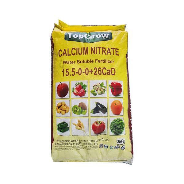 نیترات کلسیم شرکت مونباند چین با نام تجاری تاپ گرو در بسته بندی ۲۵ کیلویی که حاوی ۱۵ و نیم درصد وزنی نیتروژن و ۲۶ درصد وزنی کلسیم بر حسب cao میباشد ، مناسب جهت آبیاری و محلولپاشی برای تمامی محصولات زراعی ، باغی ، سبزی ، صیفی ، جالیز و تمامی محصولات گلخانه ای جهت رفع علائم کمبود کلسیم میباشد.