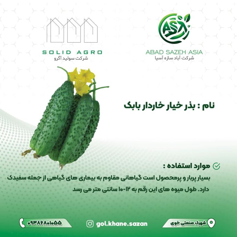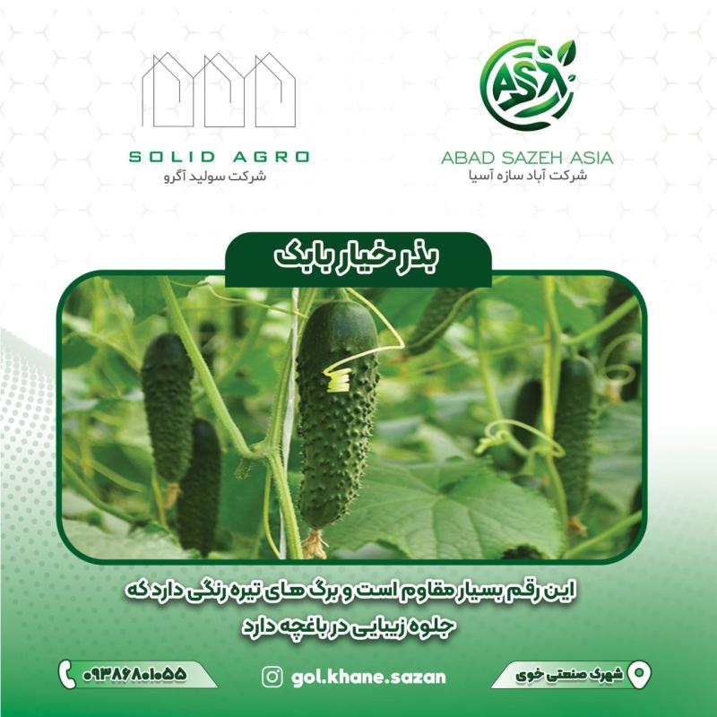 ????"خیار بابک با طراوت و کیفیت بی‌نظیر، انتخابی مطمئن برای سفره‌های ایرانی است، همان‌طور که شرکت آباد سازه آسیا، همراه کشاورزان با بهترین محصولات و خدمات، تضمین‌گر رشد و موفقیت در کشاورزی کشور است."????????