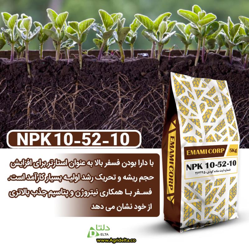 کود کامل NPK فسفر بالا اِن­ پی­ کا 10-52-10 با دارا بودن فسفر بالا به عنوان استارتر برای افزایش حجم ریشه و تحریک رشد اولیه بسیار کارآمد است. فسفر با همکاری نیتروژن و پتاسیم جذب بالاتری از خود نشان می­ دهد. تولید این کود با تکنولوژی سنتتیک مصرف ایمن آن در کشت نشاء و کشت­ های گلخانه­ ای را تضمین می­ کند.