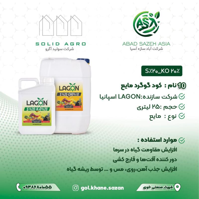 خلاصه: گوگرد مایع 25 لیتری لاگون اسپانیا یک کود چندمنظوره برای اصلاح خاک، تقویت تغذیه گیاه و کنترل نسبی آفات و بیماریها است. این محصول با جذب سریع از طریق ریشه و برگ، مناسب برای باغات، مزارع و گلخانهها بوده و به افزایش بازدهی و کیفیت محصول کمک میکند.