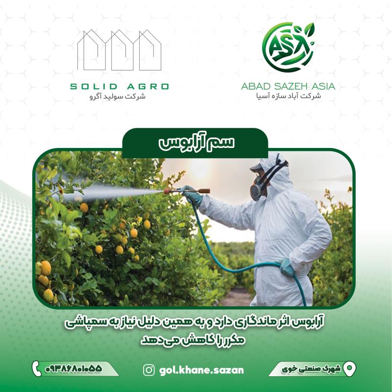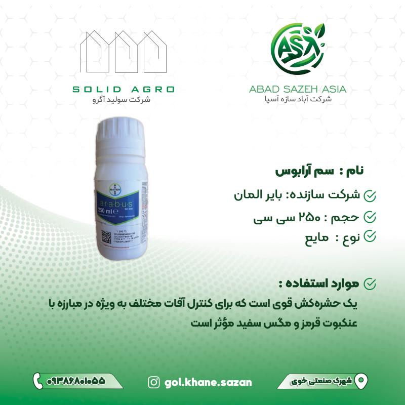 سم آبرون (Arabus) تولید شرکت بایر آلمان، یک آفتکش غیرسیستمیک با اثر تماسی و تخمکشی است که برای مقابله با آفات مکنده طراحی شده است. این سم با مکانیسم جلوگیری از ساخت چربی بدن آفات و کاهش باروری حشرات ماده، در کنترل پورهها و کاهش نسلهای بعدی آفات مؤثر عمل میکند. کاربردهای رایج شامل کنترل مگس سفید، کنههای گیاهی، تریپسها و سایر آفات مکنده در سبزیجات، صیفیجات، انگور، درختان میوه، پنبه و گیاهان زینتی میباشد.