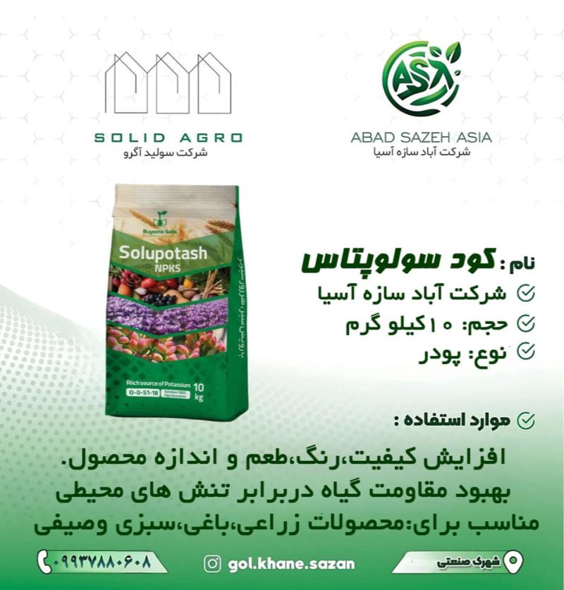 ????کود سولو پتاس یک کود کامل و محلول در آب با درصد بالای پتاسیم (K) است که معمولاً به صورت پودر کریستالی عرضه می‌شود. این کود بیشتر برای افزایش کیفیت محصول و بهبود گلدهی و میوه‌دهی استفاده می‌شود????????