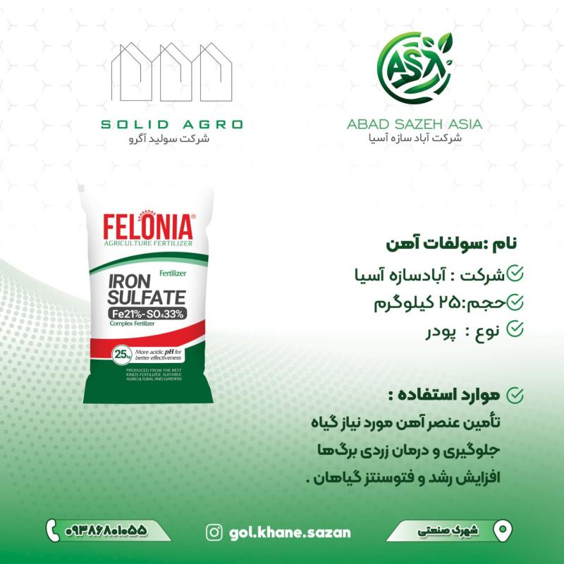 سولفات آهن یکی از کودهای رایج برای تأمین عنصر آهن (Fe) در گیاهه و بیشتر برای رفع زردی برگ‌ها (کلروز آهن) استفاده می‌شه کودی با فرمول FeSO₄ که معمولاً به‌صورت پودر یا کریستال سبز مایل به آبی عرضه می‌شه و در آب محلوله
