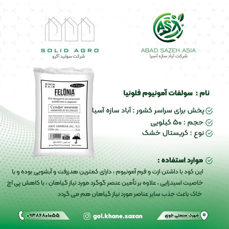 شرکت آباد سازه آسیا به عنوان تامینکننده این محصول، با سابقه از سال 1382 و نمایندگی انحصاری کارخانههای معتبر خارجی در ایران، تامینکننده انواع کودها و ملزومات گلخانهای از جمله سازهها، سیستمهای آبیاری، نایلونهای UV دار و تجهیزات کامل گلخانه میباشد. این مجموعه خدمات مشاوره فنی رایگان و مدیریت فنی گلخانه را ارائه میدهد و تامین محصولاتی با استانداردهای روز دنیا از جمله سولفات آمونیوم فلونیا را در تهران و سراسر کشور انجام میدهد.