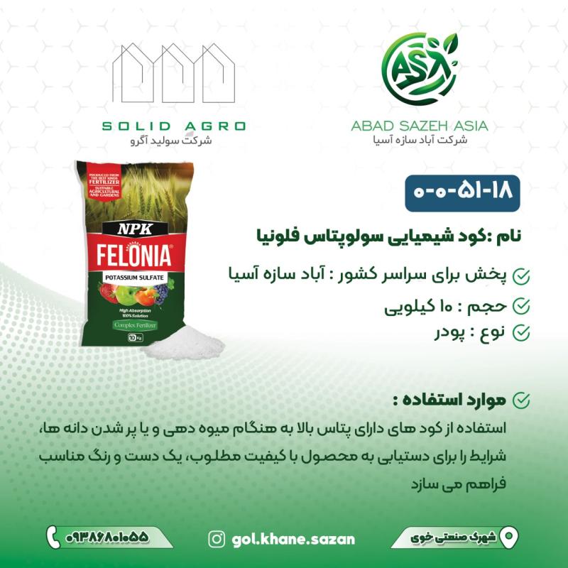 سولوپتاس فلونیا (سولفات پتاسیم، K₂SO₄) بهصورت پودری و در بستهبندی 10 کیلویی عرضه میشود و ترکیبی از پتاسیم محلول در آب و گوگرد است. این کود برای تأمین نیاز پتاسیمی گیاهان حساس به کلر و نیز برای خاکهایی که نیاز به کاهش pH دارند، مناسب است. بهواسطه حاوی بودن گوگرد، استفاده از این محصول میتواند به تعادل عناصر و بهبود کیفیت میوه و محصولات کشاورزی کمک کند.
